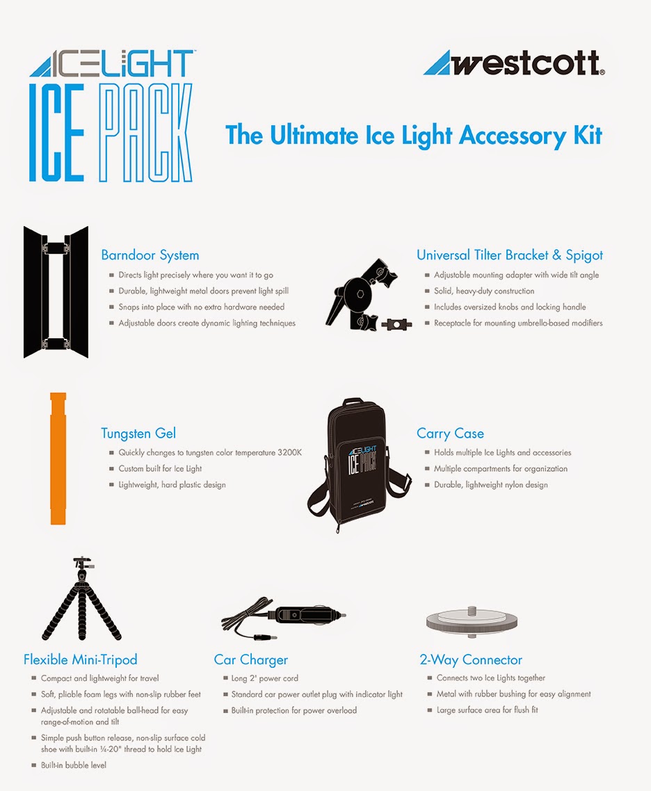 Each Ice Light comes standard with a compact travel case and 3 international power adapters, which is perfect for photographers like myself, who shoot in a variety of locations around the globe. Recently Westcott launched the Ice Light Pack Kit, so you can have even more creative options, like barndoors, color gels, connector brackets among other things… and a pretty nice carrying case.