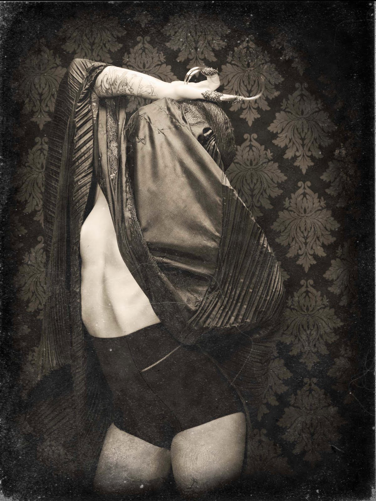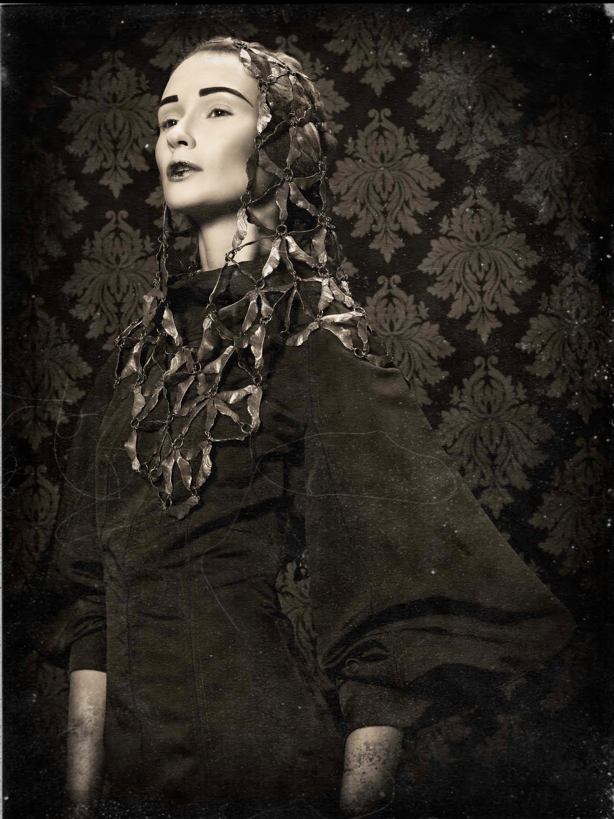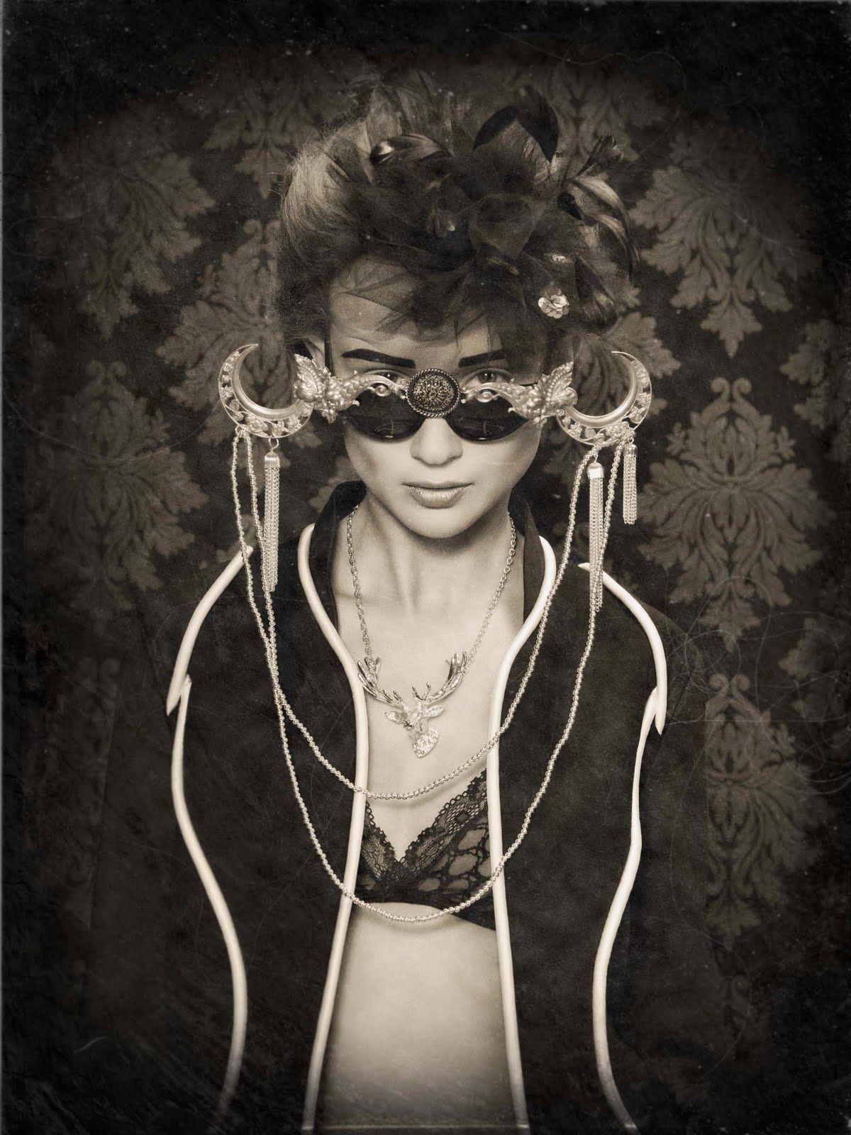 I used a variety of Westcott gear to create my images, for example two Bruce Dorn Select Asymmetrical, 12×50 Strip Bank. One strip was placed to light the background while the other was placed above the model and used as a hair light. Just below the hair light I placed a Westcott Triflector to catch all the falloff light and also to highlight the model’s accessories. My main light source is a beauty dish positioned about 30 degrees above the model. I used a Drop it Modern damask print “Vixen” Backdrop also. In post-production, I gave my images a wet plate feel.