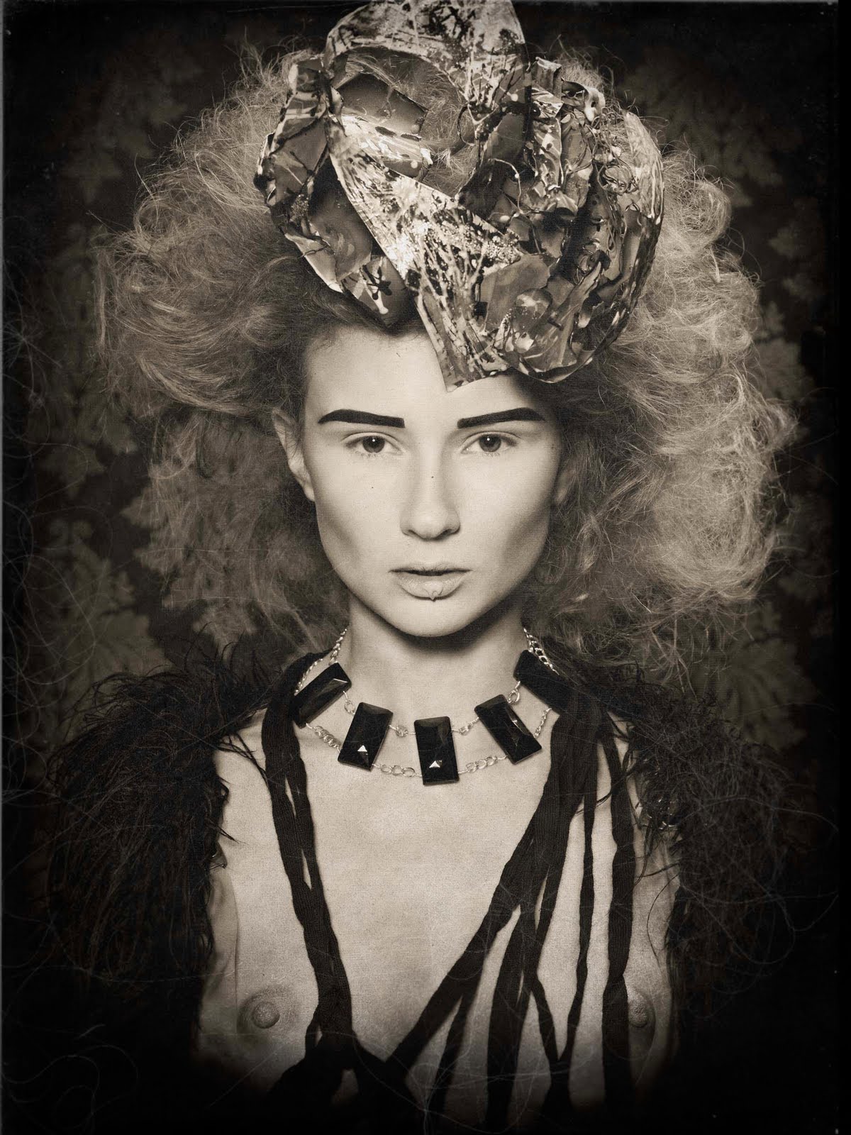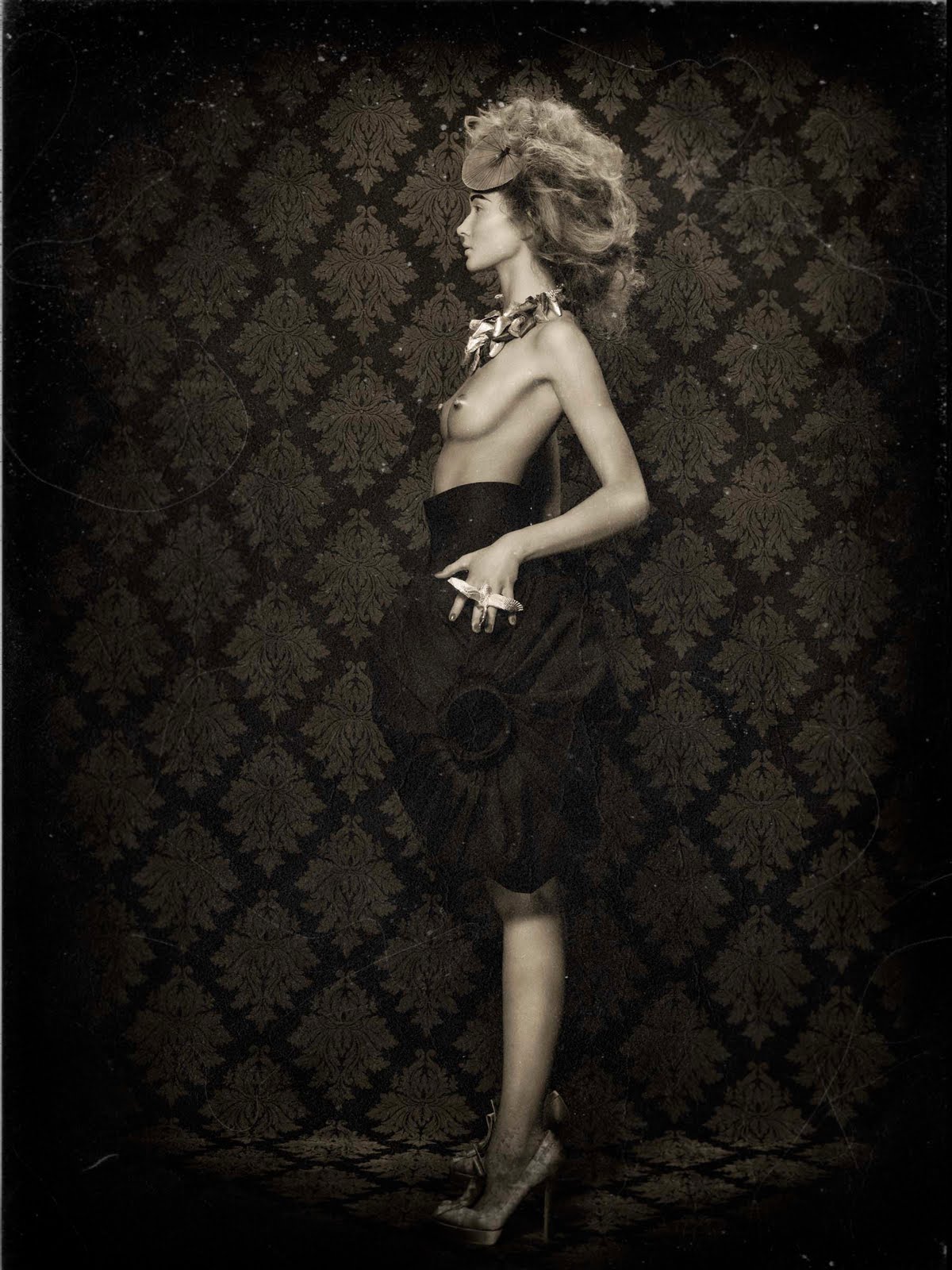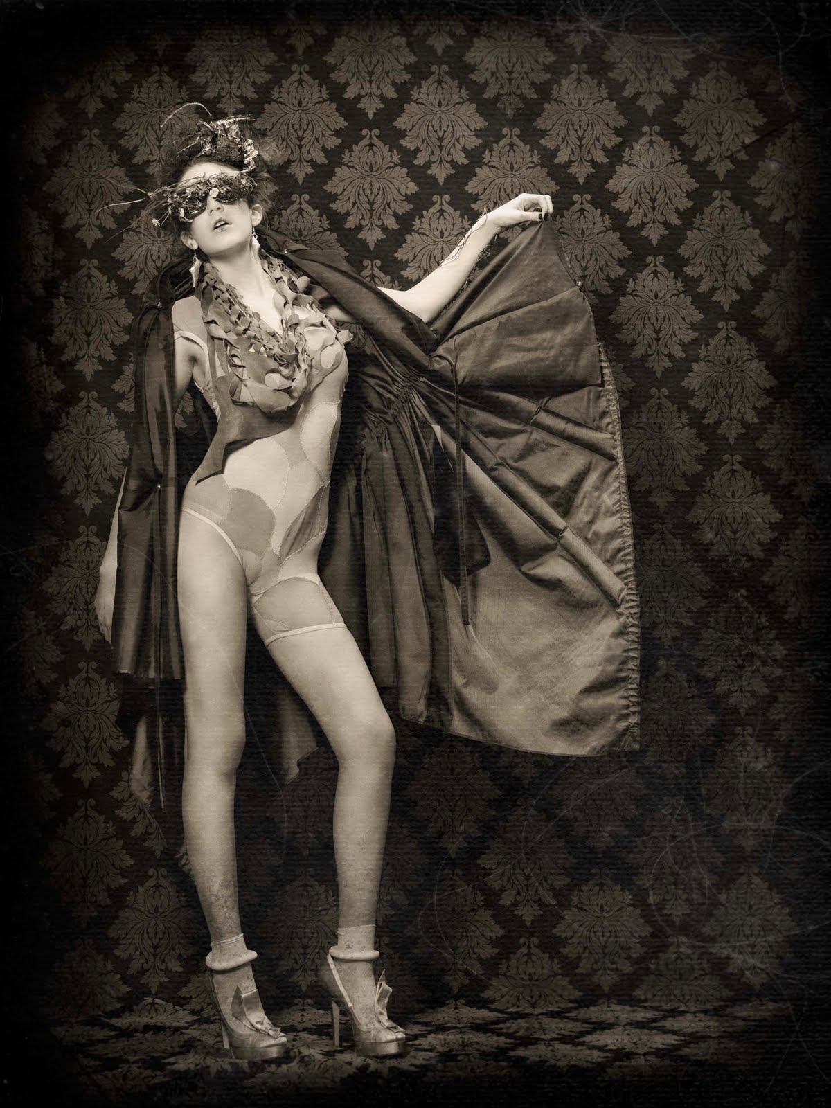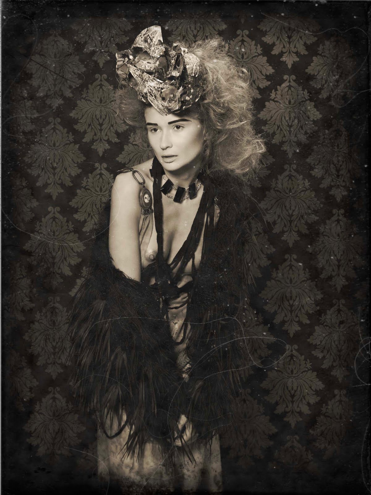 I used a variety of Westcott gear to create my images, for example two Bruce Dorn Select Asymmetrical, 12×50 Strip Bank. One strip was placed to light the background while the other was placed above the model and used as a hair light. Just below the hair light I placed a Westcott Triflector to catch all the falloff light and also to highlight the model’s accessories. My main light source is a beauty dish positioned about 30 degrees above the model. I used a Drop it Modern damask print “Vixen” Backdrop also. In post-production, I gave my images a wet plate feel.