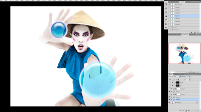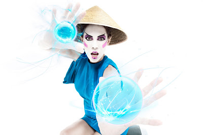 So I started changing her dress to a light blue tone using Hue/Saturation and changing the Cyans and Blues to get the tones that I wanted. For her make up I added another hue/saturation layer and to enhance the vibrancy, I used the magenta tones.