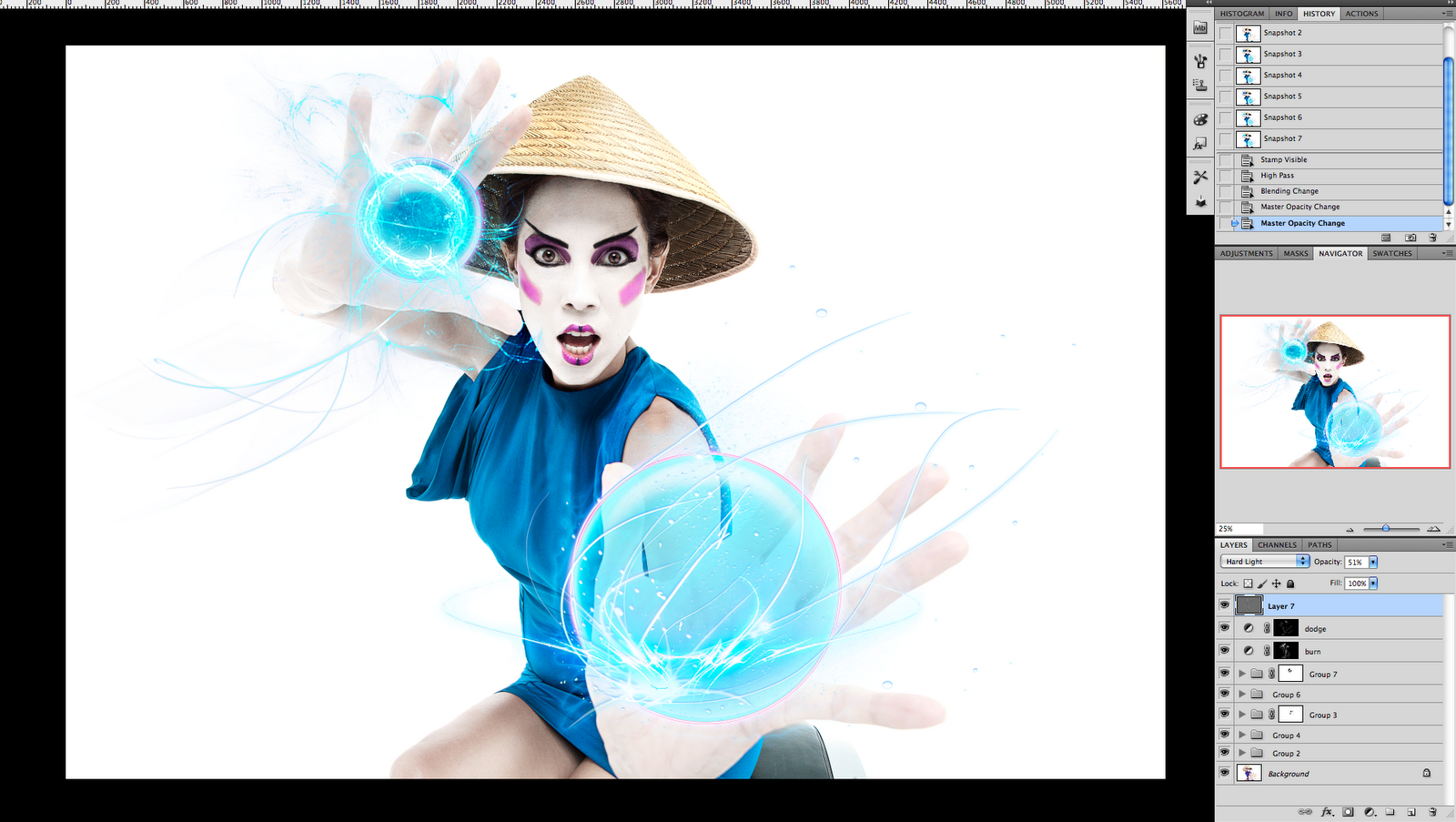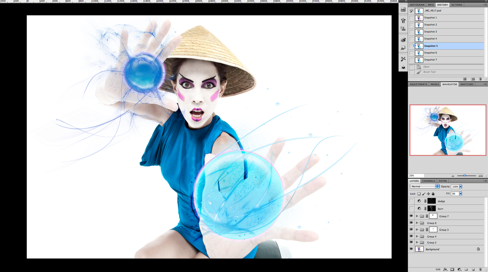We wanted to create the feel of energy emitting of her hands, so for this I added a new layer and chose a fractal brush that would give the sensation of covering the sphere.