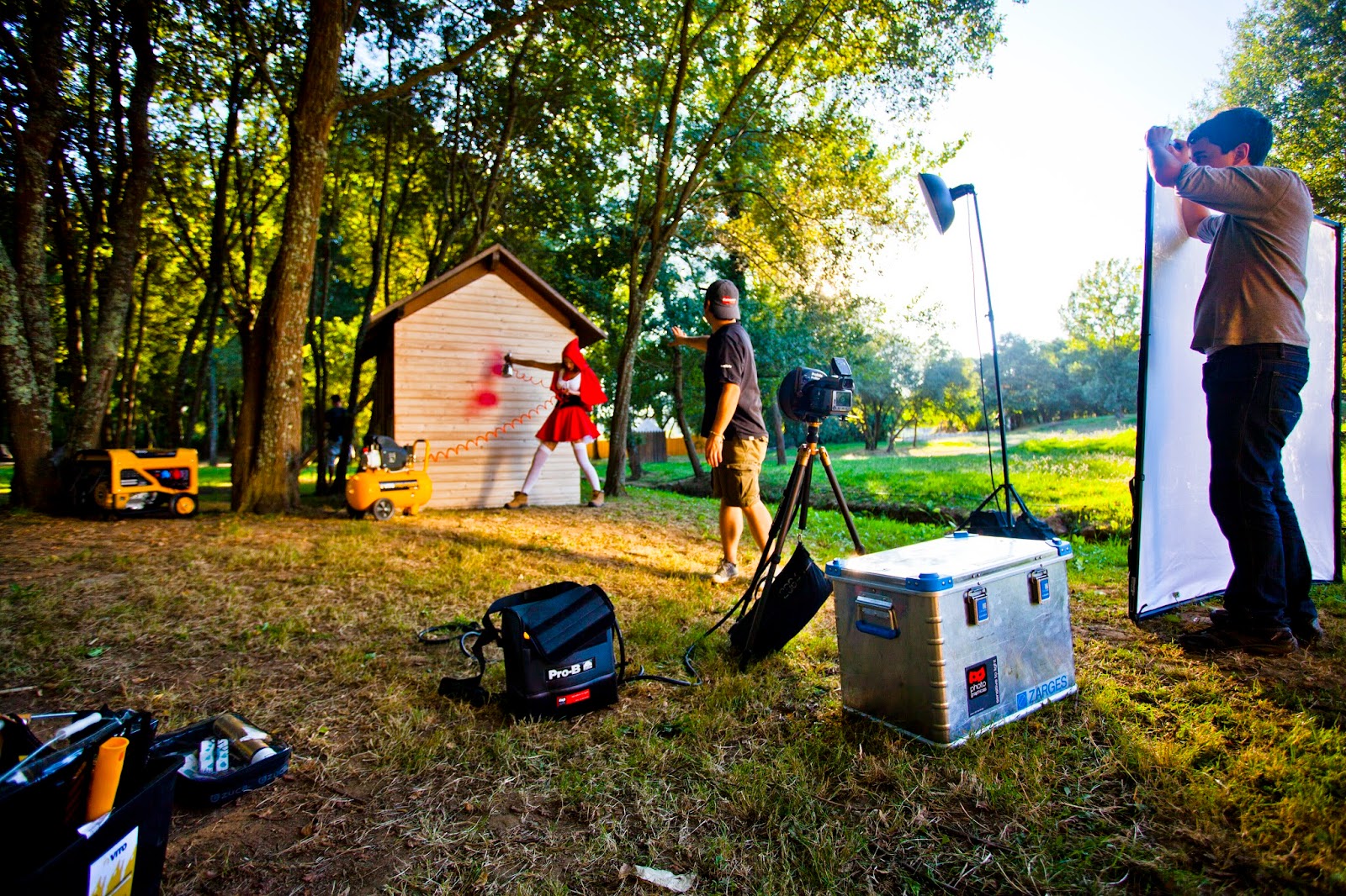My lighting setups for the entire series were a little different from image to image although some of them used the same setup. For example for the LRRH chainsaw and axe shots, we used the same lighting setup: My main light source was a Profoto Pro B3 1200 generator with a Beauty dish (aka soft light reflector) on a ProHead and then five ProHeads with zoom refelectors were placed strategically in the forest to create depth and mystery to the images. We also used a smoke machine to create a layer of fog and moodiness in the chainsaw image.