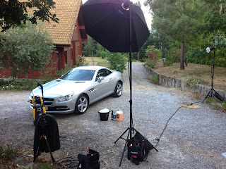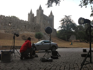 Because there was a huge difference in lighting between the sky and the castle for instance, I knew I had to light everything separately and then combine the different images in post. I shot the model and the car first, then I had my 3 assistants hold some strobes and direct them at different parts of the castle as I shot several images of the it. And finally I did an exposure for the sky.