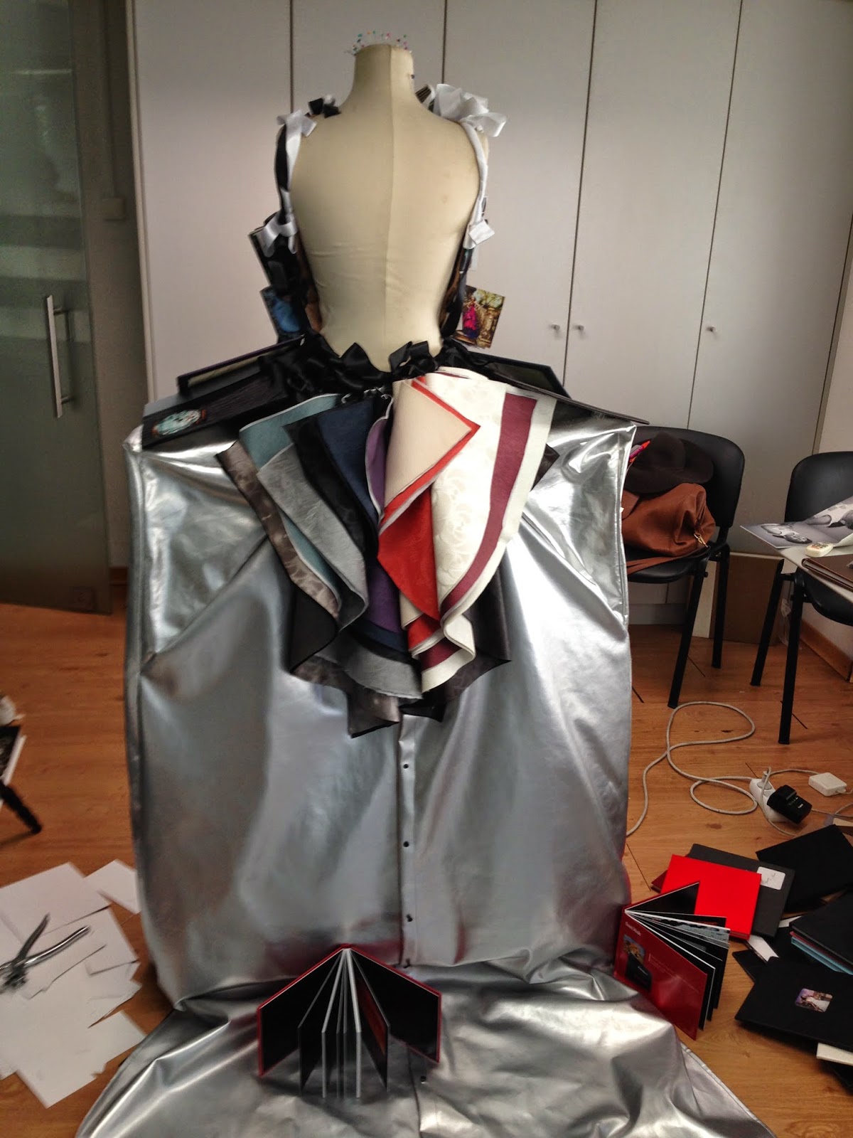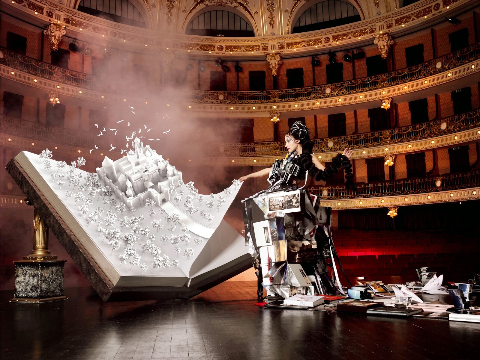 Then, after arriving at the location — a beautiful theater — the first step was to assemble the dress again and set everything up in the first room where we were shooting.