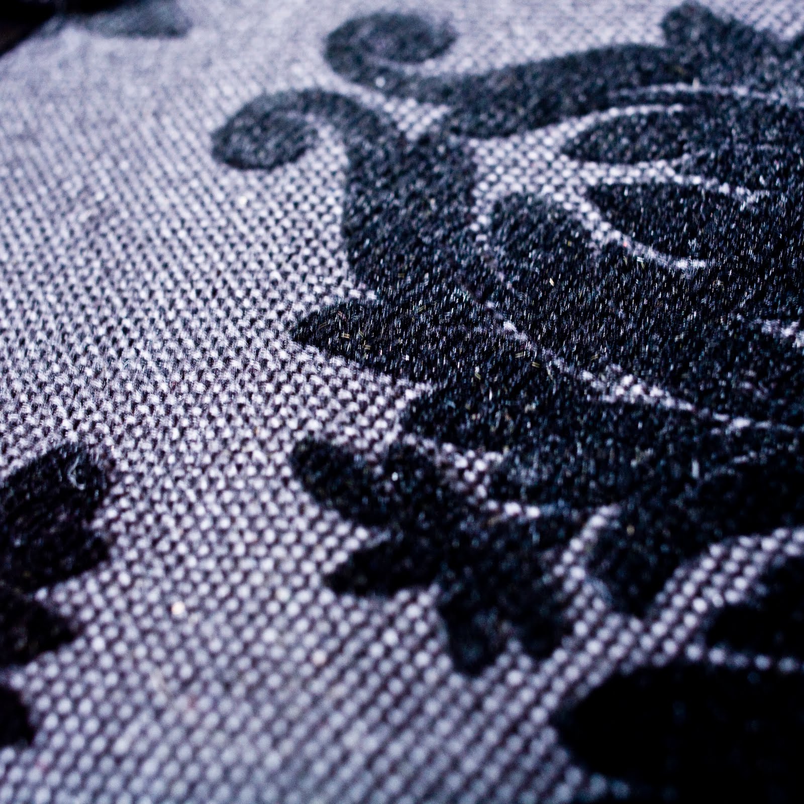 I cannot stress the quality of the backdrops- they’re a very heavy grade canvas (see detail pic below) with velvet burnout accents. They are available in a variety of sizes: 4.5ft X 6, 9 or 12ft; 9ft x 9ft and 9ft x12ft. The best part: They fold or roll up for VERY convenient packing/transporting, and are dry-cleanable- NO MORE FOOTPRINTS!