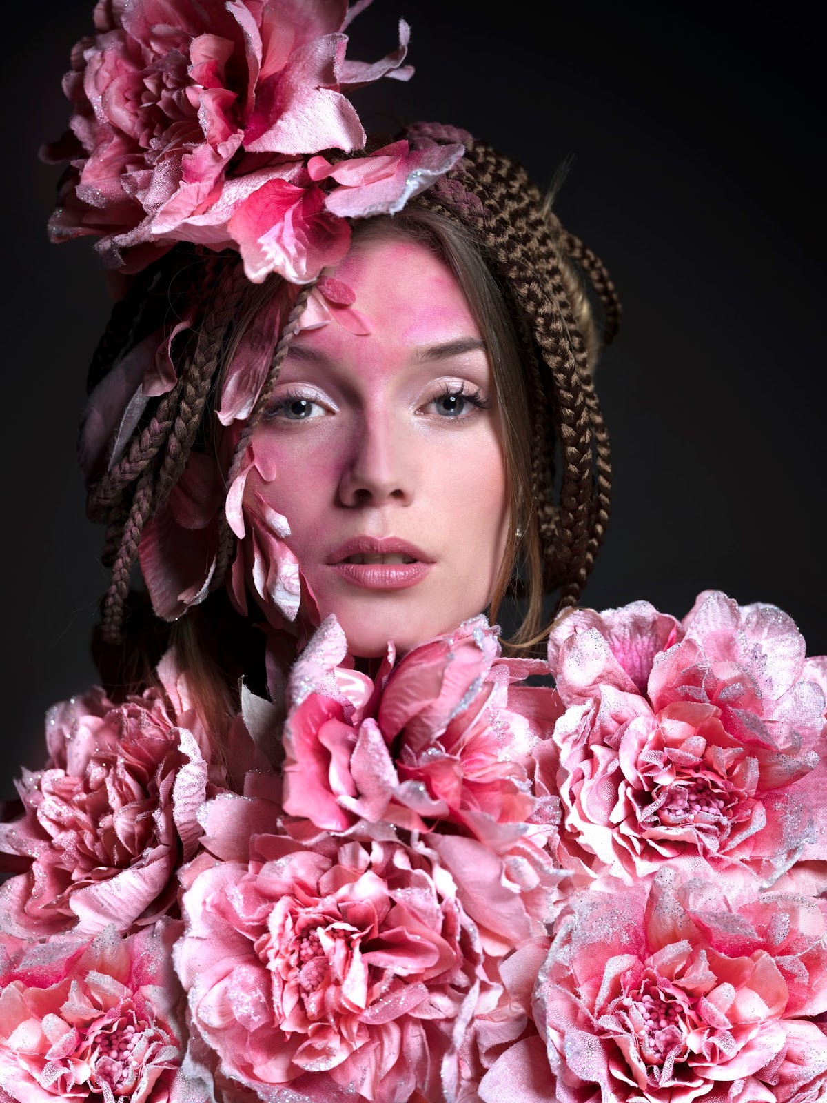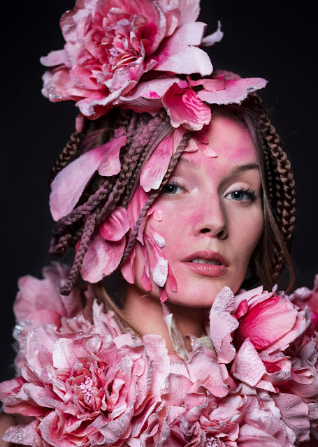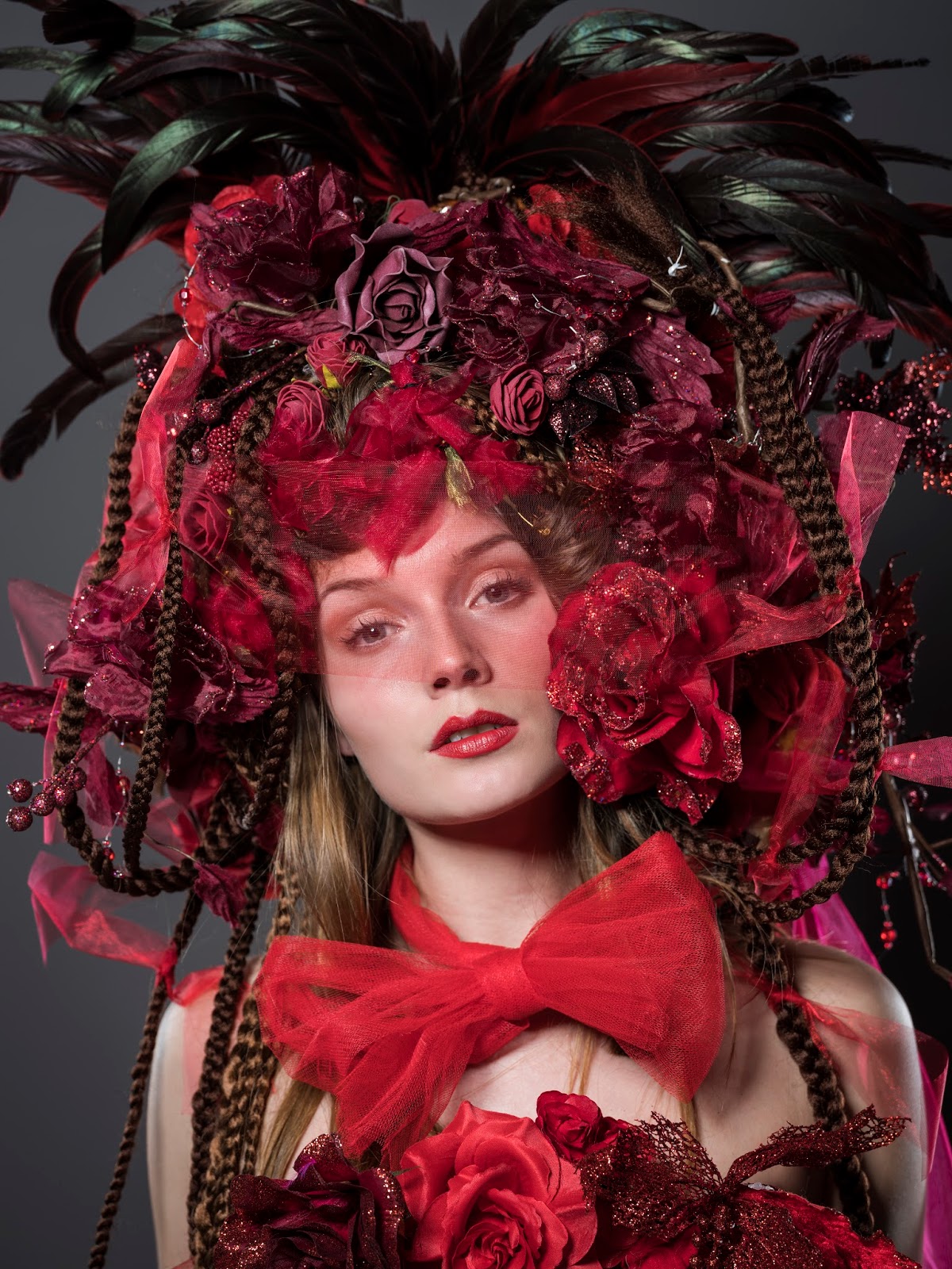 On day two our stylist nadine created a outrageous rose dress and an amazing  peacock feather and red rose headpiece and a giant red ribbon altho the second days look was beautiful executed and liked amazing if definitely had its challenges to light.