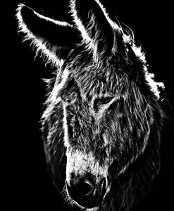 This striking artwork, titled “A Donkey’s Gaze ,” captures the essence and character of a donkey in a beautifully detailed close-up. The monochromatic black and white palette emphasizes the texture and details of the donkey’s fur and features, creating a timeless and powerful image. The high contrast between the donkey’s light fur and the dark background adds depth and drama, making the portrait stand out with a commanding presence. This piece is a perfect addition to any art collection, bringing a touch of rustic charm and elegance to any space.