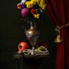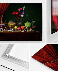 This still life, titled “The Majestic Harvest: Crowns and Nature,” beautifully blends elements of regal splendor with the bounty of nature. The composition features a rich array of crowns and luxurious accessories interwoven with a diverse assortment of fruits and vegetables, symbolizing both wealth and the natural abundance of the earth. The deep, rich tones of the backdrop enhance the vibrancy of the foreground elements, creating a visually stunning and thought-provoking piece.