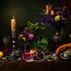 This exquisite artwork, titled “Still Life Flowers + Pomegranate,” captures a beautifully arranged bouquet of vibrant flowers in an elegant vase, complemented by a pomegranate and various other fruits on a pedestal. The rich colors and intricate details of the flowers contrast beautifully with the dark background, highlighting the textures and layers of each element. The composition is reminiscent of classic still life paintings, evoking a sense of timeless beauty and sophistication.