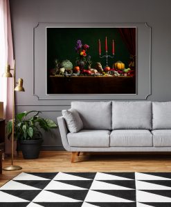 “Red Elegance: A Still Life Symphony” captures the serene beauty of a meticulously arranged still life composition. Dominated by three striking red candles that illuminate the scene, this artwork is a harmonious blend of natural and crafted elements. The vibrant red hues of the candles provide a dramatic focal point, while a diverse array of objects, including ornate vases, luscious fruits, delicate flowers, and elegant pearls, surround them. Each item is thoughtfully placed, creating a balanced and visually engaging tableau. The rich, dark backdrop adds depth and contrast, enhancing the vivid colors and intricate textures of the objects. This piece invites viewers to explore the interplay of light and shadow, color, and form, evoking a sense of timeless elegance and quiet contemplation. Available as a limited edition print, each copy is signed and numbered by the artist, ensuring its uniqueness and authenticity.