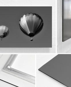 This captivating image, titled “Up in the Air,” features two hot air balloons soaring gracefully against a clear sky. The monochromatic palette enhances the timeless and serene atmosphere, highlighting the textures and contours of the balloons. The larger balloon takes the foreground with its intricate details visible, while the smaller balloon in the background adds depth and perspective to the scene. This photograph evokes a sense of freedom, adventure, and tranquility.