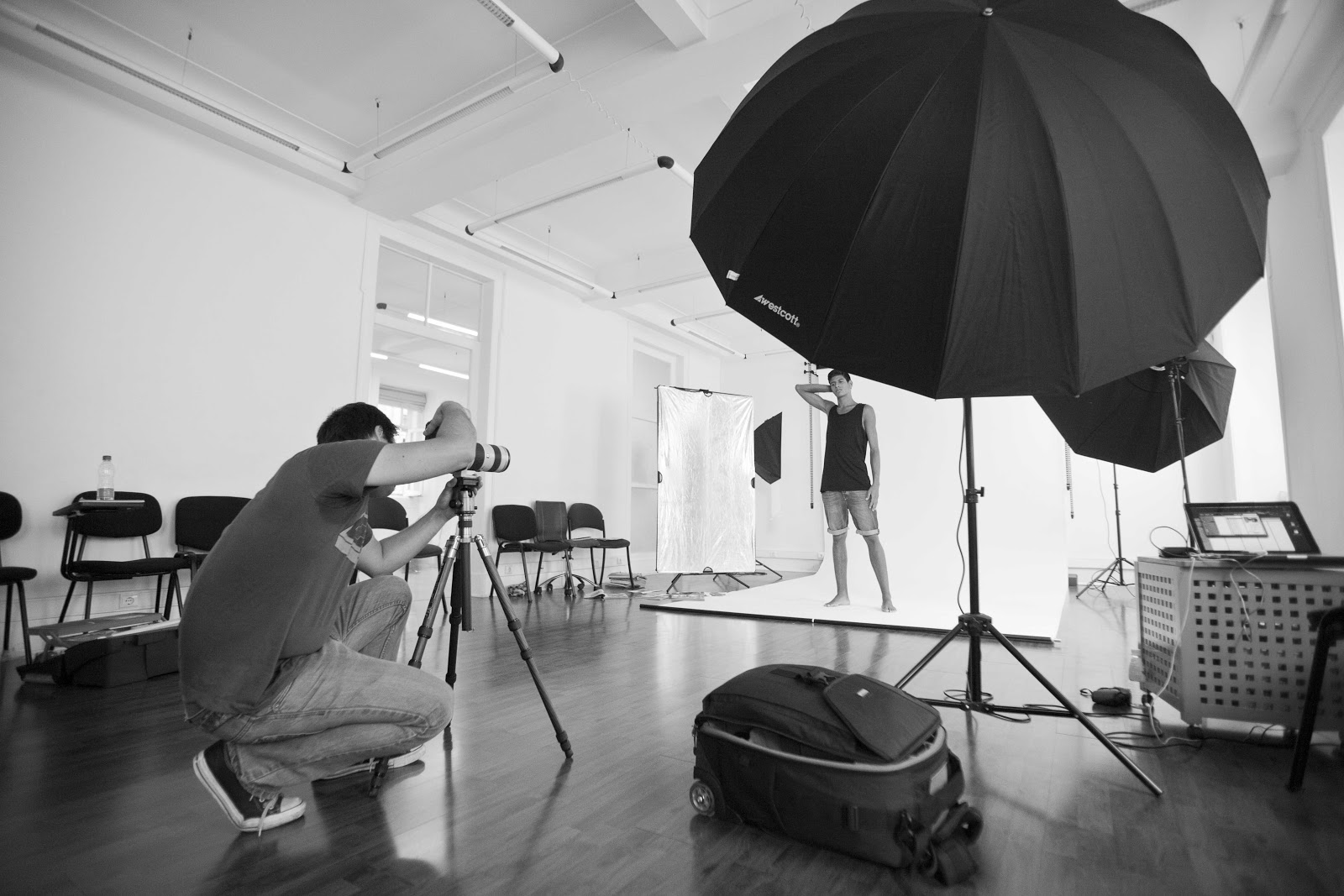 In this case the agency already has a mini studio area. My backdrop was a white seamless which is great because you can add or subtract light and have either a black, grey or white backdrop with a minimum investment. My light setup for the day is simple: I start by using two strobes for the backdrop with silver umbrellas and a third with a Westcott Octabank.